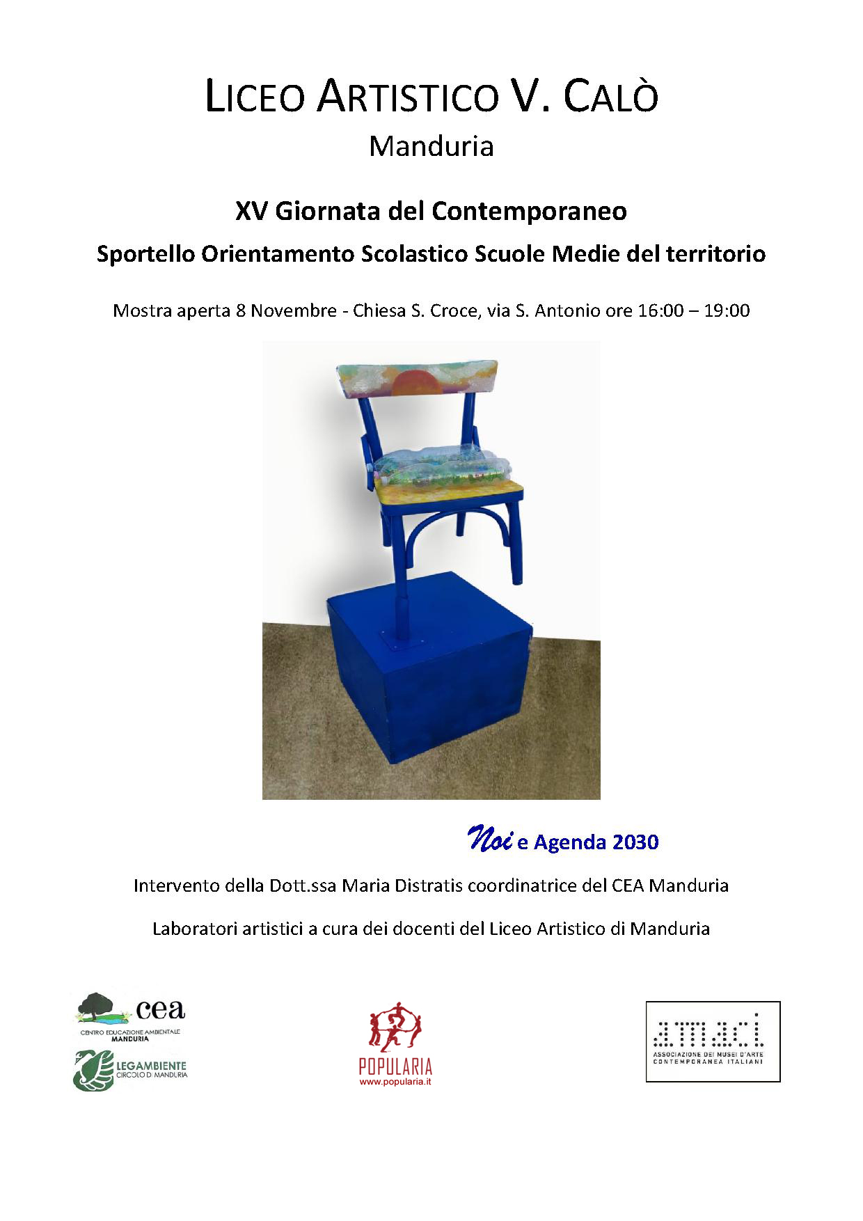 Venerdì 8 novembre dalle 16:00 alle 19.00 presso la chiesetta di Santa Croce a Manduria, sarà aperta la mostra dei lavori degli alunni delle scuole medie Marugj, Fermi e Prudenzano realizzati insieme agli alunni del Liceo artistico di Manduria in occasione della XV Giornata nazionale dell’arte contemporanea che si è tenuta lo scorso 25 ottobre presso il liceo artistico Calò di Manduria nell’ambito della GIORNATA DEL CONTEMPORANEO.