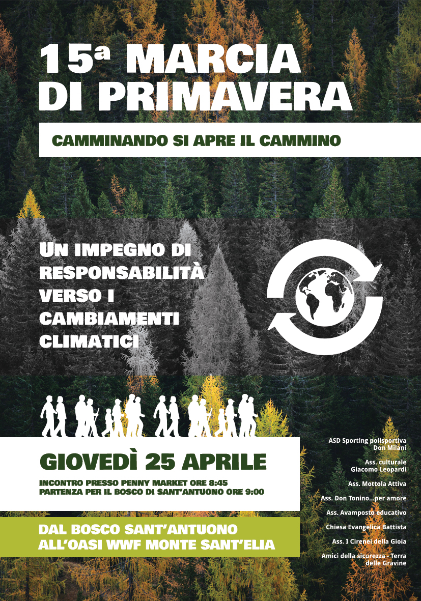 Si svolgerà giovedì 25 aprile la “XV^ Marcia di Primavera”, una cammina silenziosa, organizzata dall’Associazione Mottola Attiva, che ha lo scopo di sensibilizzare verso il problema dei cambiamenti climatici, dell’inquinamento derivante da fonti fossili, della salvaguardia della natura e dell’ambiente, della tutela della biodiversita’…