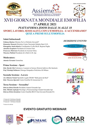 Per celebrare la XVII Giornata Mondiale dell’Emofilia le associazioni A.Ma.R.A.M. Aps e Assieme onlus organizzano l’evento online Sport, Lavoro e Sessualità in Emofilia. L’accendiamo? che si terrà sabato 17 aprile dalle ore 16:00 alle 18:00 sulla piattaforma Zoom.