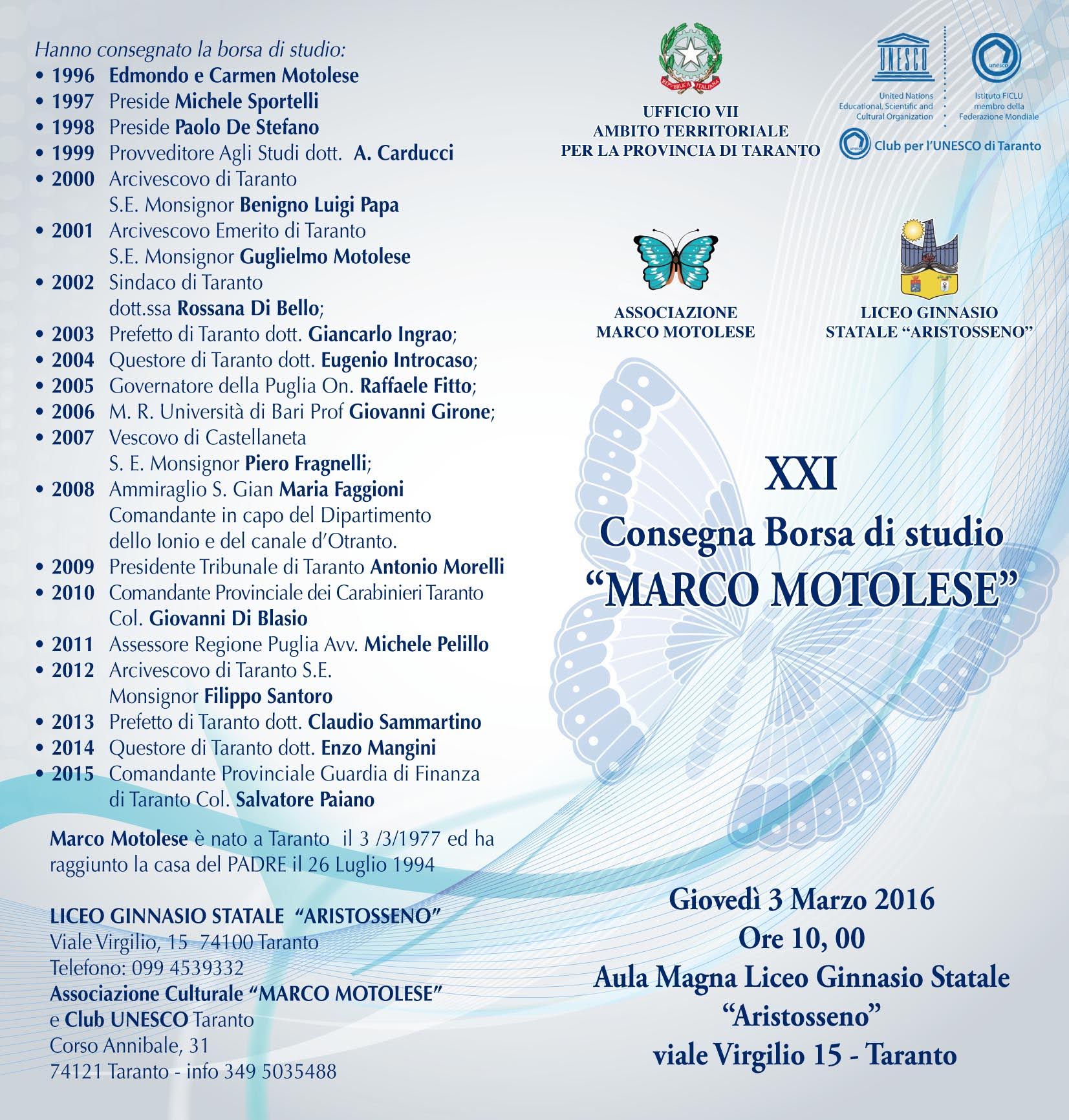 Questo il tema della manifestazione di consegna della XXI borsa di studio Marco Motolese che si terrà giovedì 3 marzo alle ore 10.00 presso l’Aula Magna del Liceo Aristosseno in viale Virgilio 15 a Taranto.