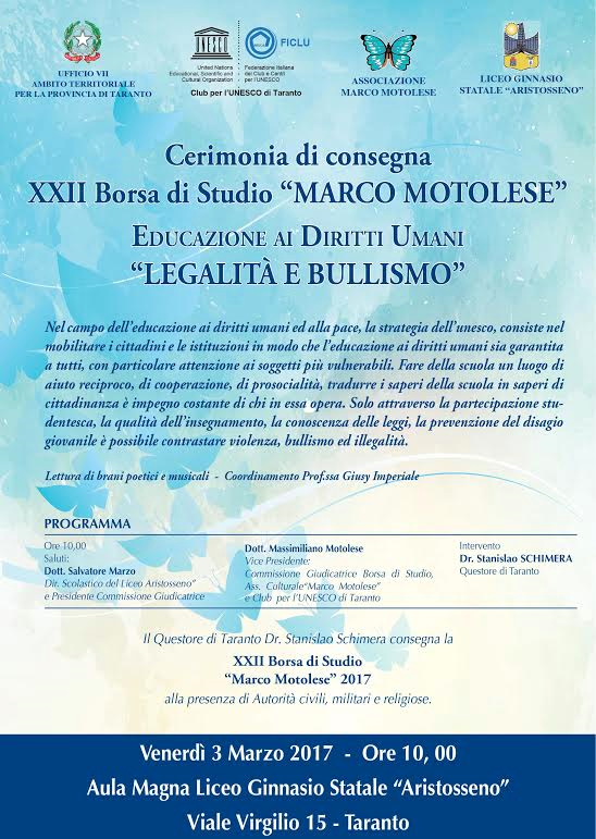 Istituita nel 1996 dalla famiglia di Marco e a lui dedicata la manifestazione vede la collaborazione del Club per l’UNESCO di Taranto, dell’Associazione Marco Motolese e del liceo Aristosseno. La borsa di studio, viene da ormai ventidue anni, consegnata nel giorno del compleanno di Marco che quest’anno avrebbe compiuto quaranta anni. Tema della ormai storica manifestazione sarà: Educazione ai Diritti Umani ”Legalità e Bullismo” due temi forti del nostro vivere contemporaneo, ma mentre il primo riguarda tutti senza esclusioni di sorta, il secondo spesso tocca più direttamente i giovani. Consegnerà la borsa di studio, alla presenza di autorità civili, militari e religiose, dopo un suo intervento sul tema il Questore di Taranto Dr. Stanislao SCHIMERA. Mentre i saluti saranno porti dal Dott. Salvatore Marzo Dir. Scolastico del Liceo Aristosseno” e Presidente Commissione Giudicatrice e dal Dott. Massimiliano Motolese Vice Presidente: Commissione Giudicatrice borsa di studio, Ass. Culturale“Marco Motolese” e Club per l’UNESCO di Taranto.