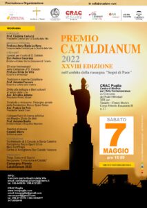 Sabato 7 maggio alle ore 18:00 si terrà – nell’ambito della rassegna di arte contemporanea “Segni di Pace” – presso il Centro di Ricerca per l’Arte Contemporanea – CRAC Puglia in C.so Vittorio Emanuele II, 17 nel centro storico di Taranto, la presentazione e la premiazione della XXVIII Edizione del Premio Cataldianum 2022, promosso e organizzato dal Comitato per la Qualità della Vita, dall’Arcidiocesi di Taranto, dall’Istituto per la Storia e l’Archeologia della Magna Grecia in collaborazione con le associazioni: #Ante Litteram, Gruppo Taranto, Tarenti Cives e FAI delegazione di Taranto.