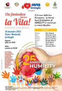 In occasione del 25° anniversario della nascita, l’AVIS di Grottaglie, in collaborazione con la band Grottagliese “HUMILITY”, presenta: Che fantastica storia è la vita – Evento Solidale. Il ricavato della serata sarà devoluto ai Reparti di Oncologia Pediatrica e U.T.I.N. dell’Ospedale Ss. Annunziata di Taranto.