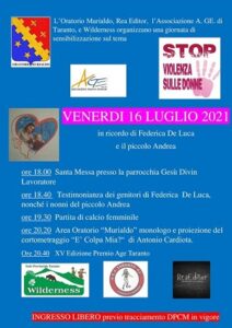 Riprendono oggi le iniziative dell’Associazione Italiana Genitori di Taranto con la XV edizione del Premio A.GE. Taranto che sarà preceduta da un’iniziativa, in ricordo di Federica De Luca uccisa dal marito insieme a suo figlio, Andrea il 7 giugno del 2016 a Taranto. L’evento, organizzato dall’ A.Ge. Taranto in collaborazione con l’Oratorio “Murialdo”, Rea Editor e Wilderness, affronterà il tema della violenza contro le donne. Questo il programma: 18:00 Santa Messa presso la Parrocchia Gesù Divin Lavoratore; 18:40 intervento dei genitori di Federica De Luca nonché nonni del…