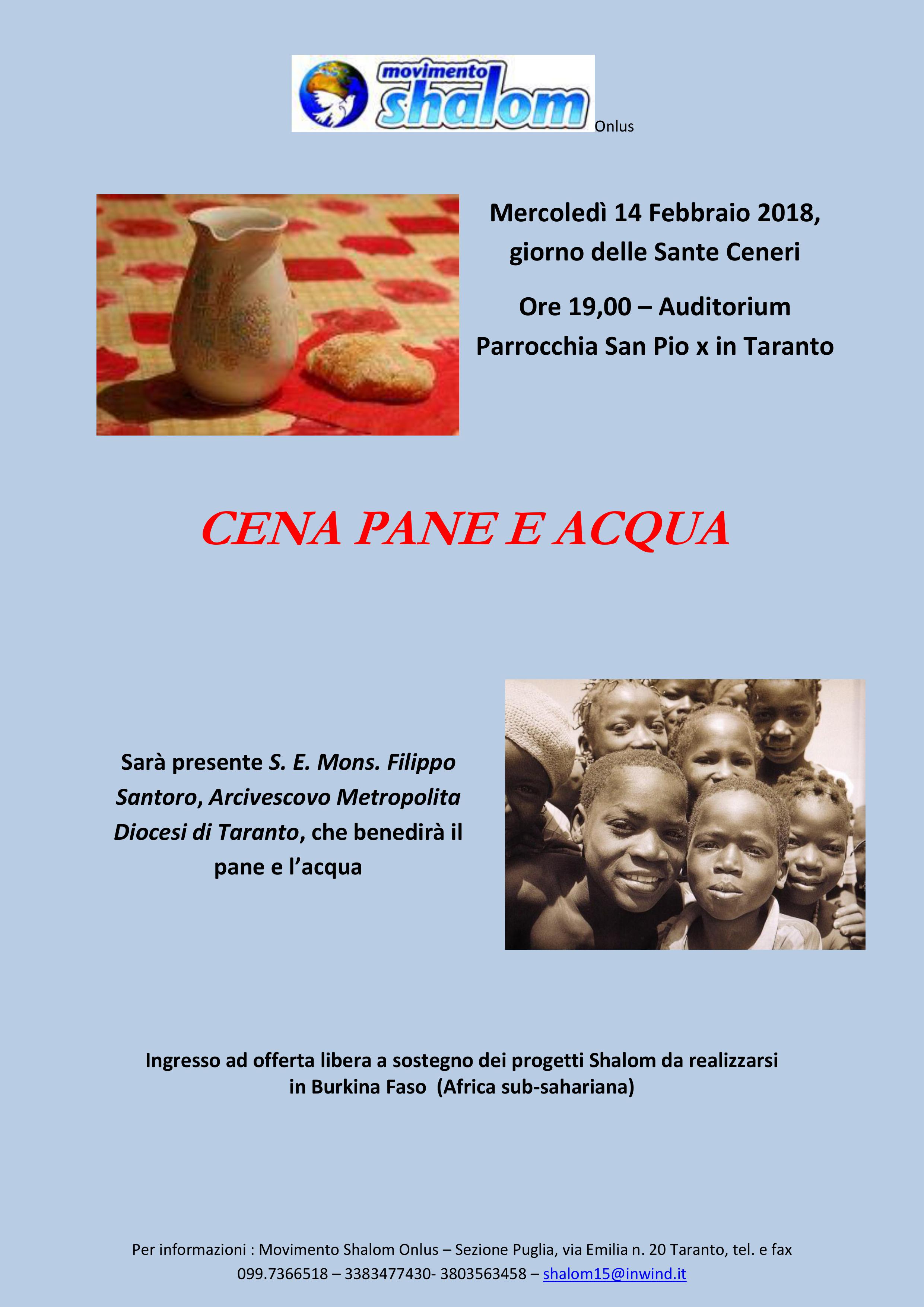 Mercoledì 14 febbraio p.v. , nel giorno delle Sante Ceneri, il Movimento Shalom Onlus – Sezione Puglia invita soci, associazioni e cittadinanza, al di là del credo religioso, ad unirsi insieme per la consueta iniziativa quaresimale della CENA A PANE E ACQUA che si terrà alle ore 19.00 nell’Auditorium San Pio X in piazza S. Pio X in Taranto, dopo la S. Messa.