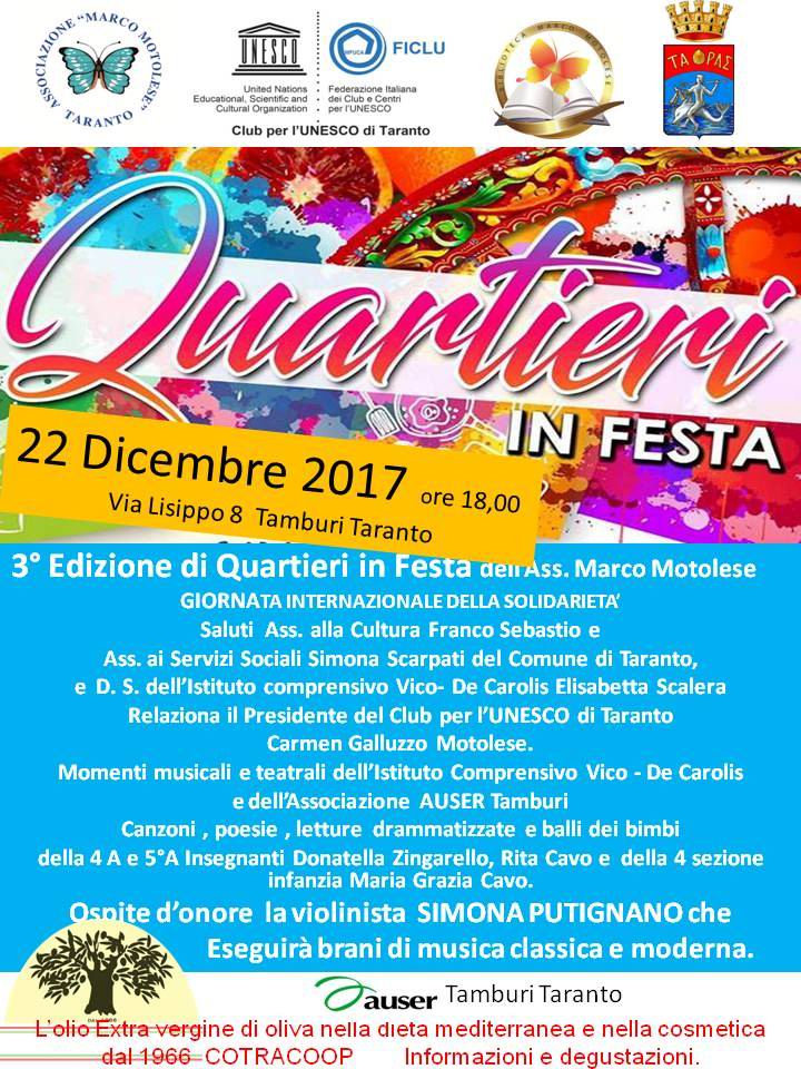 Domani, venerdì 22 dicembre, alle ore 18,00 nel salone della Biblioteca Marco Motolese, in via Lisippo n.8 al quartiere Tamburi, come ogni dicembre torna la manifestazione organizzata dall’Associazione Marco Motolese e dal Club per l’UNESCO di Taranto dal titolo Quartieri in Festa.