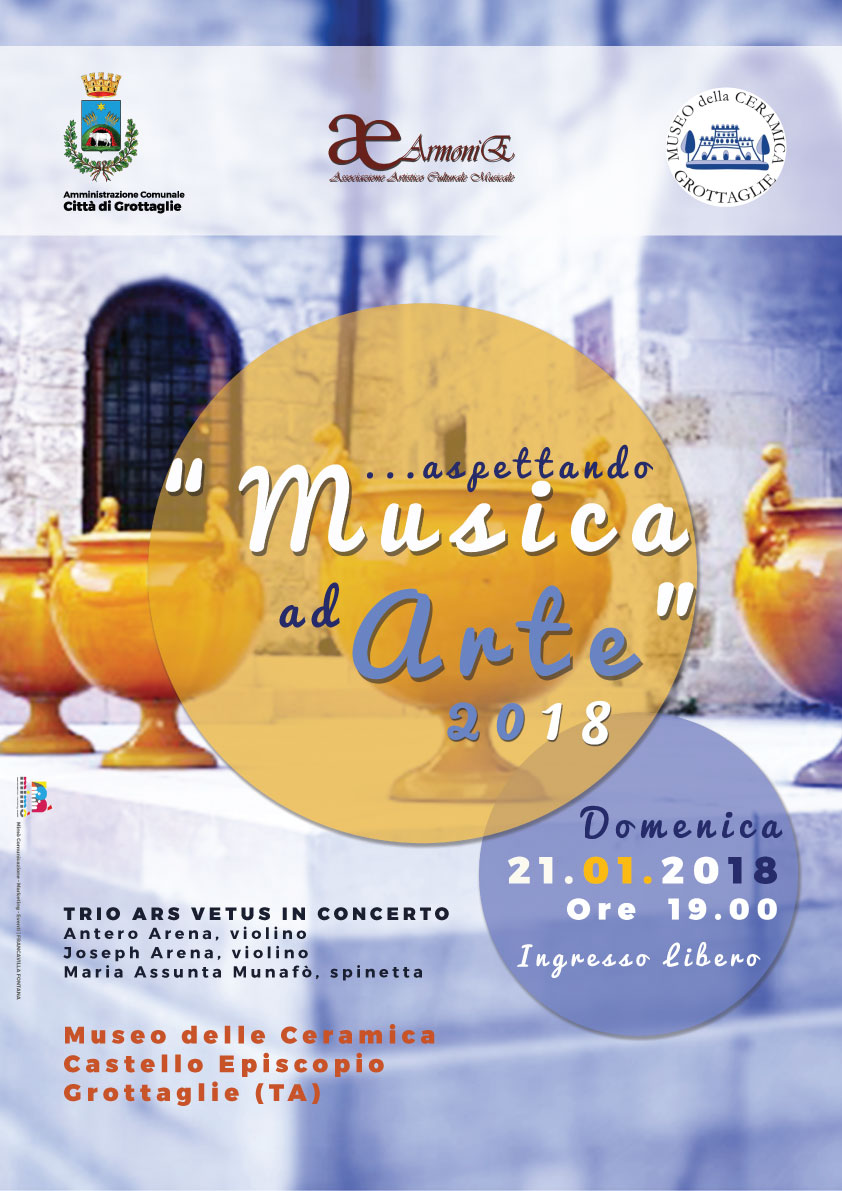 Continuano gli eventi abbinati all’Arte nei siti di pregio della Città di Grottaglie promossi da Associazione ArmoniE e patrocinati dall’Assessorato alla Cultura del Comune di Grottaglie: domenica 21 gennaio alle ore 19:00, nel Museo della Ceramica all’interno del Castello Episcopio, il TRIO ARS VETUS, composto da Antero Arena – Violino, Joseph Arena – Violino e Maria Assunta Munafò – Spinetta proporrà un programma barocco con musiche di Arcangelo Corelli, Georg Friedrich Händel, Giovanni Battista Bassani, Tomaso Giovanni Albinoni, Antonio Vivaldi e Giovanni Antonio Pandolfi, un musicista messinese del XVII secolo riportato in auge dal Trio.