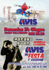 Per diffondere la cultura della donazione del sangue, domenica 24 giugno alle ore 20:30 l’AVIS comunale Taranto organizza la manifestazione Avis in Festa – I edizione.