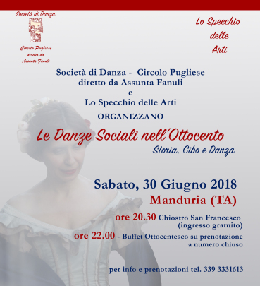 La Società di Danza Circolo Pugliese e Lo Specchio delle Arti presentano Le Danze Sociali nell’Ottocento – Storia, Cibo e Danza, una serata tutta ottocentesca che inizierà alle 20:30 di sabato 30 giugno nel Chiostro di San Francesco in piazza Vittorio Emanuele II a Manduria.