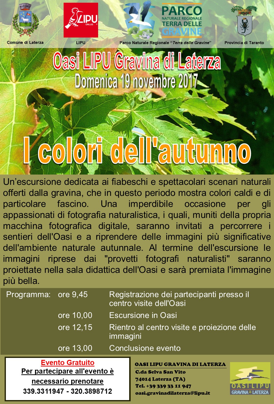 Un’escursione per immergersi nei caldi colori autunnali della gravina di Laterza quella organizzata domenica 19 novembre dalla LIPU nell’ambito del programma Eventi-Natura 2017 dell’Oasi LIPU Gravina di Laterza.