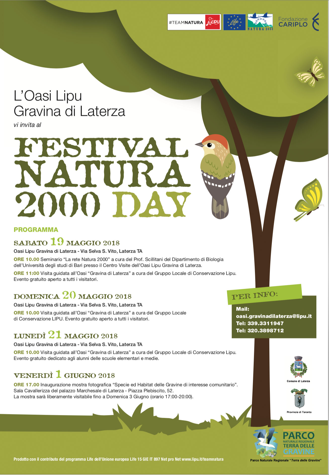 Si terrà presso l’Oasi LIPU Gravina di Laterza a partire dal 19 maggio alle ore 10,00 il Festival Natura 2000 Day, che rientra nell’ambito del progetto LIFE GIE IT 897 Net Pro Net.
