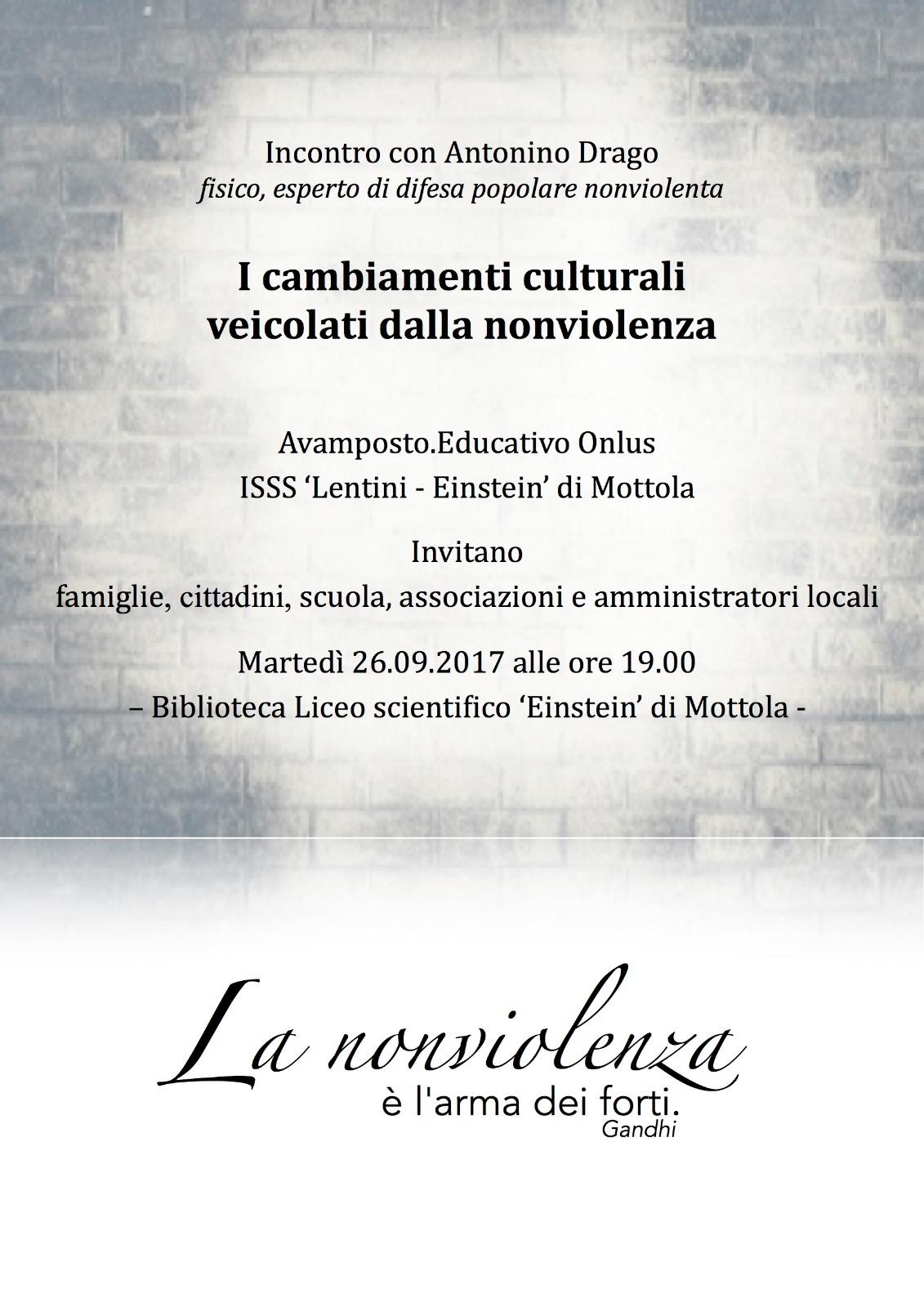 Nel percorso di approfondimento e di sensibilizzazione all’impiego della nonviolenza nei contesti relazionali e di gruppo, l’Associazione Avamposto.Educativo propone il questo pomeriggio alle ore 19.00 presso la Biblioteca del Liceo Scientifico ‘Einstein’ di Mottola, un incontro pubblico su I cambiamenti culturali veicolati dalla nonviolenza.