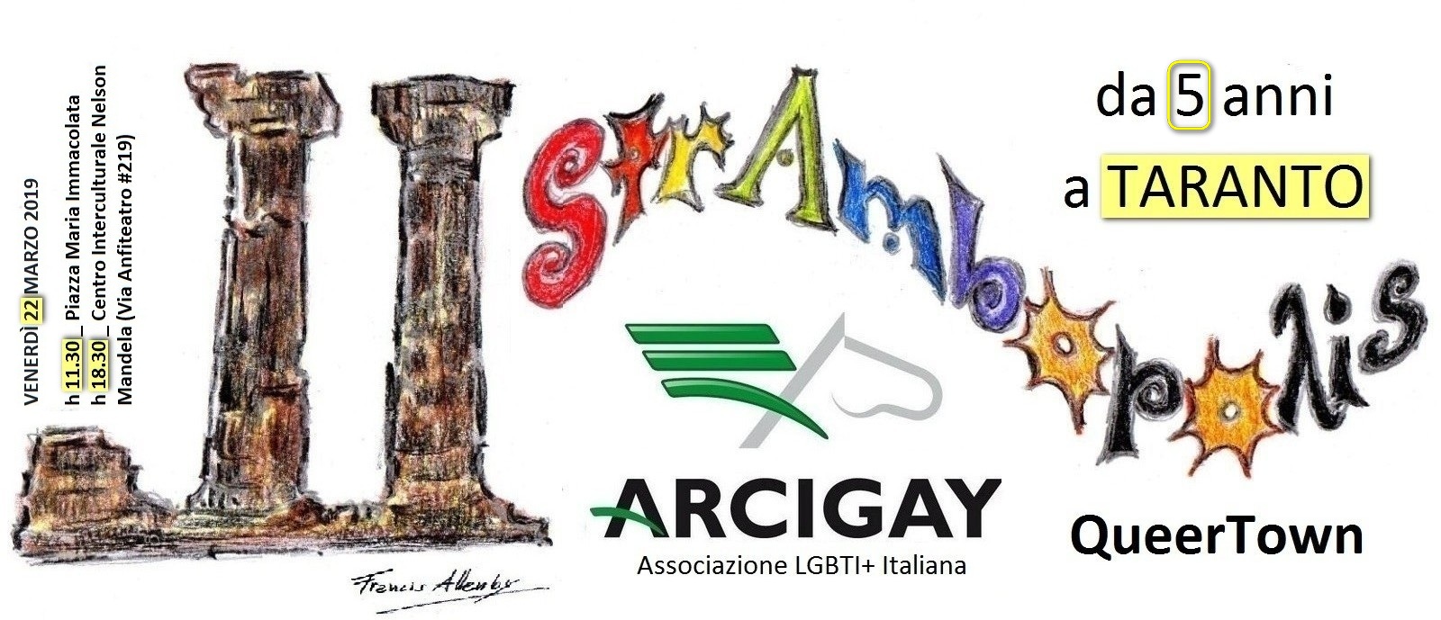 - a partire dalle ore 18.30 il Gruppo Giovani propone, presso il Centro Interculturale Nelson Mandela, l’incontro dal titolo Cinque anni con Arcigay a Taranto. Conosciamoci e conosciamo il Movimento LGBTIQ+: dalla L di libertà al + del NOI.