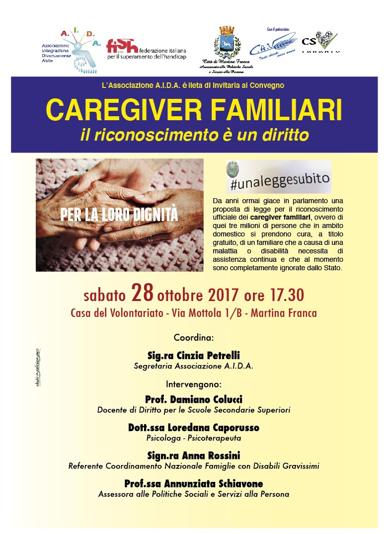 Ed è questo il tema, una legge subito per i caregiver familiari, ossia coloro che offrono cura a titolo gratuito, che l’associazione AIDA tratterà sabato 28 ottobre alle ore 17.30 presso la “Casa del volontariato” a Martina Franca.
