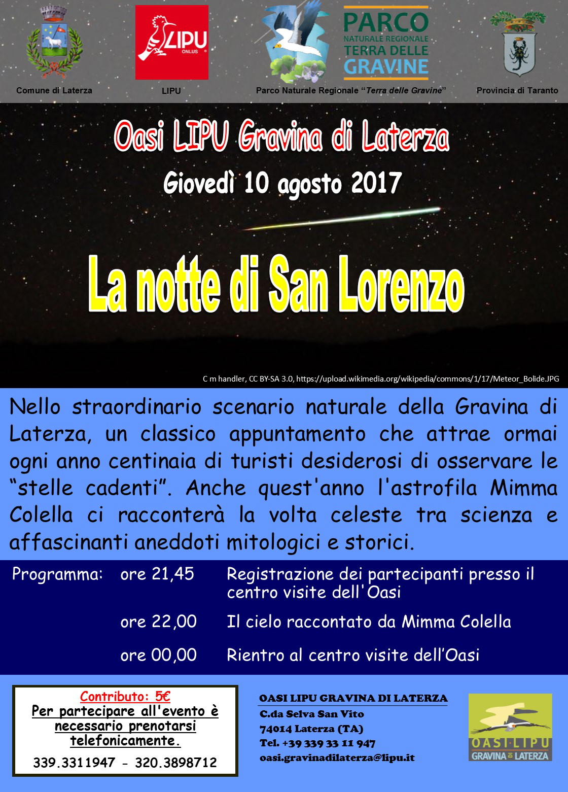Nell’ambito del programma Eventi-Natura 2017 dell’Oasi LIPU Gravina di Laterza giovedì 10 agosto alle ore 21.45 si terrà l’evento La notte di San Lorenzo, un classico appuntamento che attrae ormai ogni anno centinaia di turisti desiderosi di osservare le “stelle cadenti”.