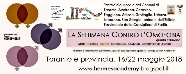 In occasione della Giornata Internazionale contro l’OmoBiTransfobia, su richiesta delle associazioni Hermes Academy Onlus e Strambopoli, Presidio Arcigay nella provincia di Taranto, dal balcone centrale di Palazzo di Città a Taranto e sulla facciata del Municipio di Carosino , del Municipio di Grottaglie e dei Municipi di Faggiano, di Ginosa, di Leporano, di San Giorgio Jonico, da mercoledì 17 maggio sventola la bandiera arcobaleno, a testimonianza dell’impegno profuso dalle amministrazioni locali nella lotta contro ogni forma di discriminazione.