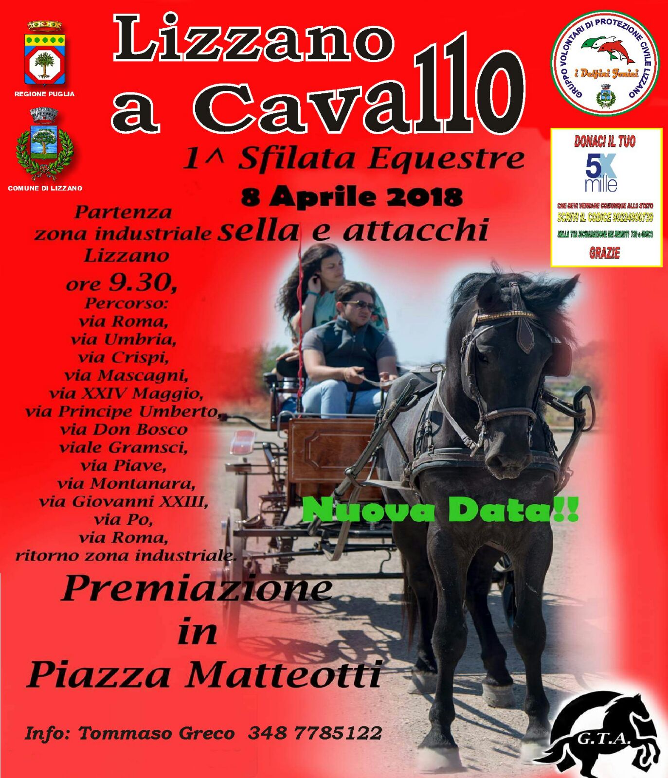 Nuova data, domenica 8 aprile, per l’iniziativa organizzata dal Gruppo volontari di Protezione Civile di Lizzano “I Delfini Jonici” dal titolo Lizzano a cavallo.