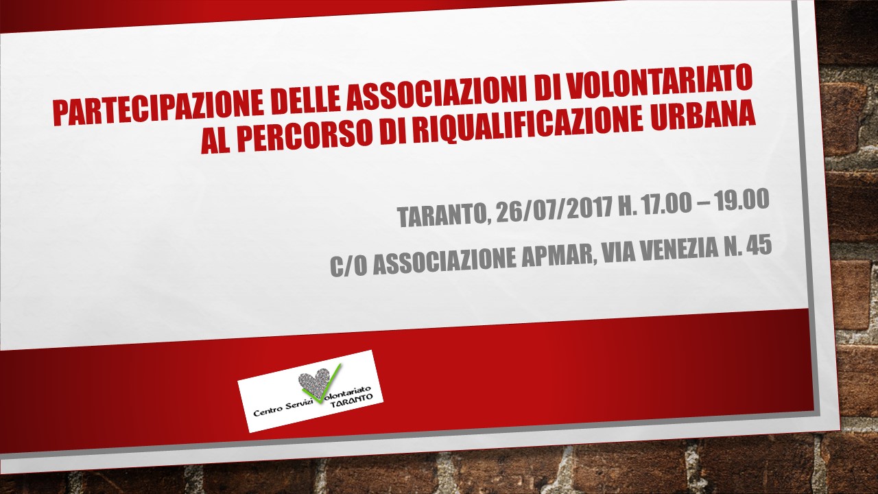 L’incontro, rivolto alle Organizzazioni di volontariato di Taranto, si terrà c/o la sede dell’associazione APMAR in Via Venezia n. 45.