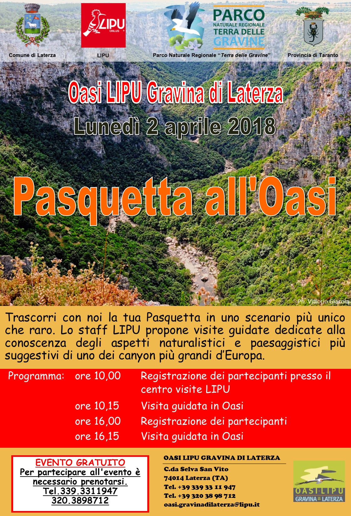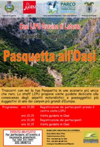 L’evento, chiamato Pasquetta all’Oasi, rientra nell’ambito del programma Eventi-Natura 2018 dell’Oasi LIPU Gravina di Laterza ed è gratuito.