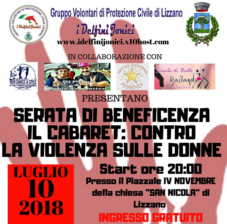 Il Gruppo volontari di protezione civile I Delfini Jonici di Lizzano propongono una serata di cabaret contro la violenza sulle donne, per tenere viva l’attenzione su questo tema così attuale.
