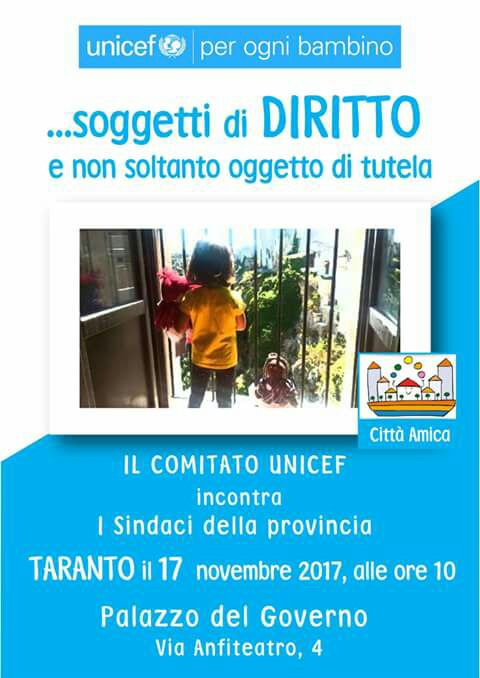 Domani, venerdì 17 novembre p.v. sarà …Soggetti di Diritto e non soltanto oggetto di tutela il tema trattato nel corso dell’incontro tra il Comitato Unicef di Taranto e i sindaci della provincia previsto alle ore 10:00.