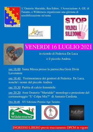 Riprendono oggi le iniziative dell’Associazione Italiana Genitori di Taranto con la XV edizione del Premio A.GE. Taranto che sarà preceduta da un’iniziativa, in ricordo di Federica De Luca uccisa dal marito insieme a suo figlio, Andrea il 7 giugno del 2016 a Taranto.