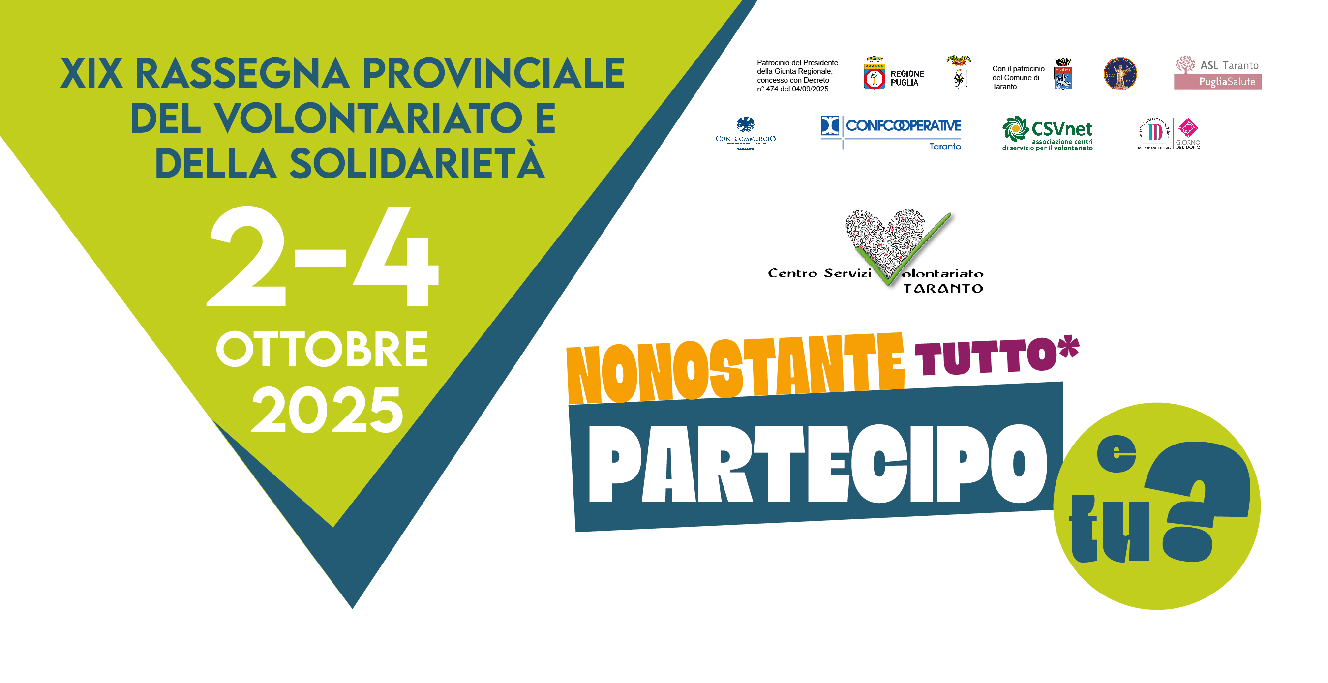 L’importante iniziativa che CSV Taranto ETS organizza annualmente per promuovere il volontariato, gode del patrocinio del Presidente della Giunta Regionale, concesso con Decreto n°474 del 04/09/2025, di quello della Provincia di Taranto, del Comune di Taranto, dell’ASL Taranto, dell’Arsenale Militare Marittimo, di Confcooperative e Confcommercio Taranto e di CSVnet – Associazione Nazionale dei Centri di Servizio per il Volontariato. La XIX Rassegna, che si terrà dal 02 al 04 ottobre prossimi, rientra nel Giro dell’Italia che Dona promosso dall’IID – Istituto Italiano della Donazione in occasione del “Giorno del Dono” – 4 ottobre 2025. Questa giornata, di cui ricorre quest’anno il decennale #DonoDay2025 – #10annidiDonoDay è dedicata a chi fa del dono una pratica quotidiana.